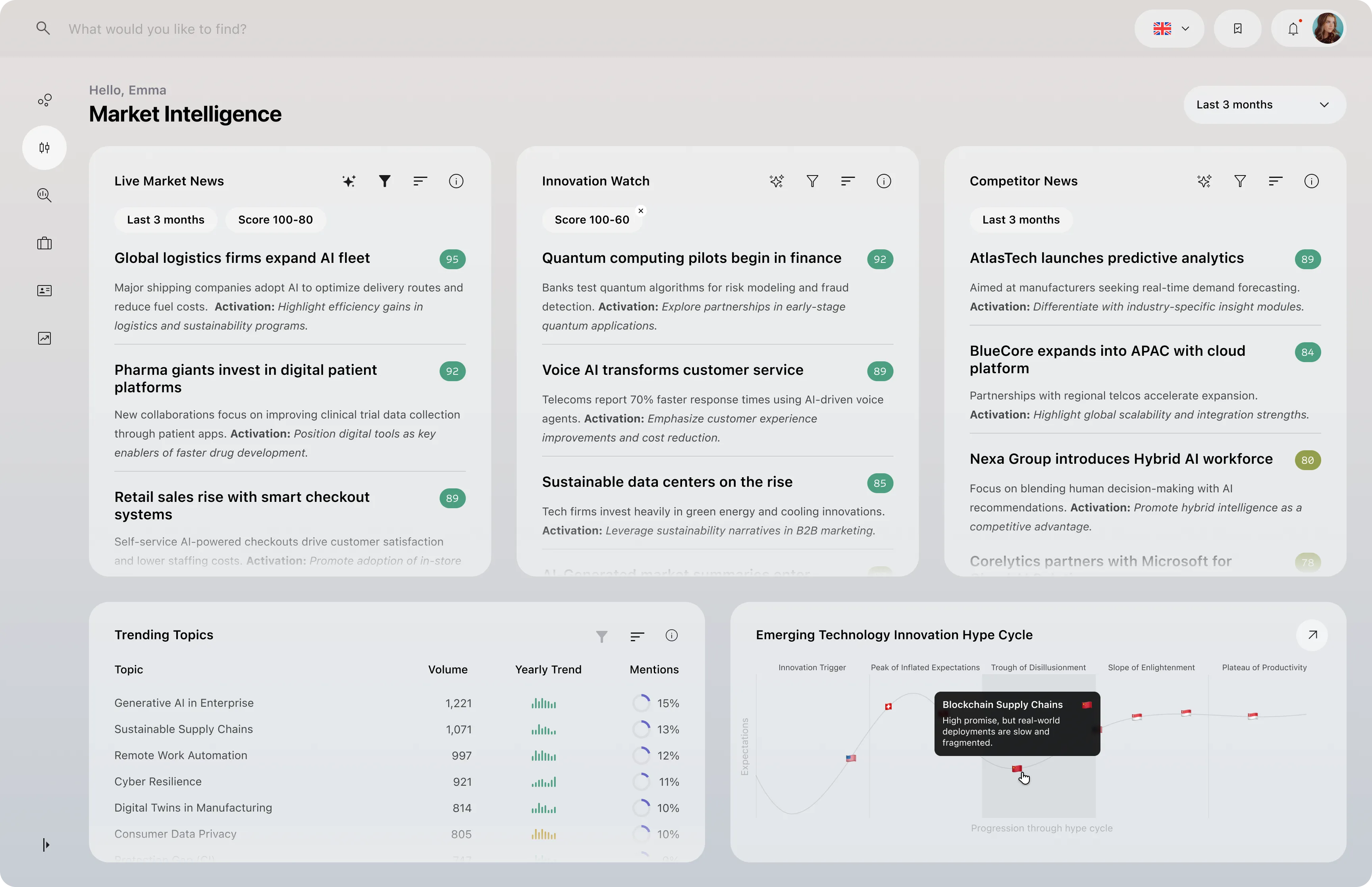 Track sentiment, emerging needs, and trends across sources. Detect early signals to act before competitors.